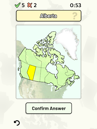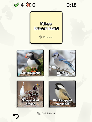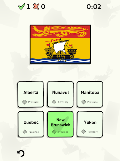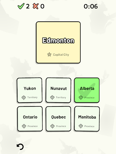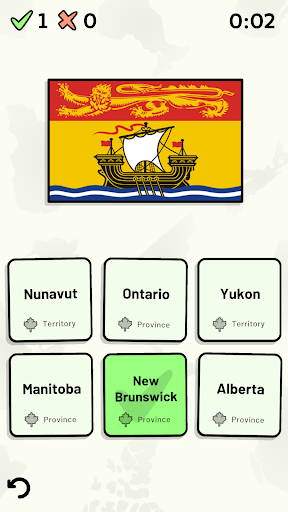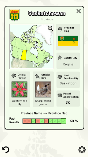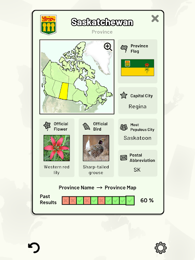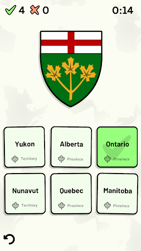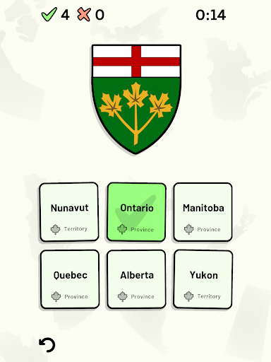 Customizable quizzes allow you to choose which of Canada's provinces and territories to test, as well as the topic. Past results for each Canadian province and territory are displayed to highlight your progress at each topic. Standard quizzes allow you to learn each topic by progressing through a series of levels.