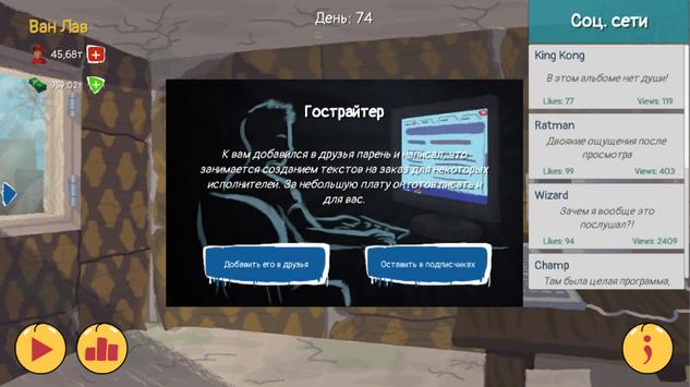 The game allows you to go from the very beginning, when you do not have a single fan and not a penny in your pocket, to the icon of Russian rap. In it, you will be able to record tracks, both by yourself and together with other artists, shoot clips, give concerts, participate in rap battles and pump your skills. Life will constantly boil around you and events will take place! The more popular you become, the more attention you get from your fans or, perhaps, the opposite of haters. Follow the trends or create them yourself in The Rap Way!