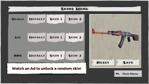 The survivor starts with weak weapons. Small magazine capacities and high recoil. As the player starts racking up kills, stronger guns become available. Work your way up from pistols, to fully automatic rifles, to rocket launchers! Weapon skins are unlockable for free so that you can customize the game according to your flair.