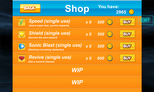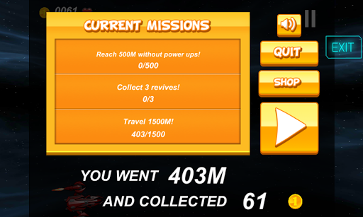 Tap the screen and move your Spaceship. Try to avoid the obstacles and complete the missions. Take the Coins and use the PowerUps like the Speed to move very fast, the Shield to survive the next impact once, the Sonic Blast to destroy the incoming obstacles and the Revive the get another chance. Special Audio and Graphic effects have been used.If you like it, please leave a positive review