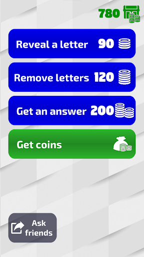 ★ 3 options of help available in the game: “Reveal 1 letter”, “Remove all wrong letters” and “Get an answer”. Also, free coins that requires getting the help you need can be redeemed by watching short in-game videos or can be purchased at discounted prices.