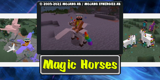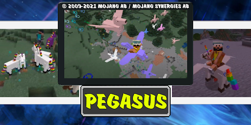 Magic unicorns mod open a world full of adventures and mythical creatures, including unicorns, butterflies and of course pegasus. If you take a beautiful horse and give it wings, you get a pegasus. Flying horse faster than flash and ender dragons. You can not only watch the herds graze on the grass and fly high in the sky, but also tame them, become their friend and then ride them. As soon as you start your journey and exploration, this mysterious world will not leave you indifferent, running up to the flower you will see a beautiful insect - a butterfly, endowed with incredible colors and beauty. A place of spawn of colorful insects of the plains, flower fields and on the marvelous islands of fly agarics. Everyone will find a horse to their liking because there are a large number of colors of these creatures. Each horn is colorful. The add-on contains skins of boys and girls in the style of pegasus with a horn and a beautiful mane.