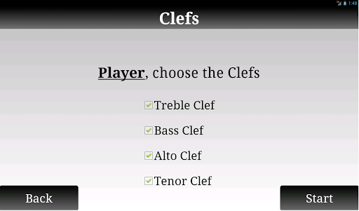 You can choose between treble, alto, tenor and bass clefs and also make a combination of those. Each correct note will have a value depending on the difficulty of your combination.