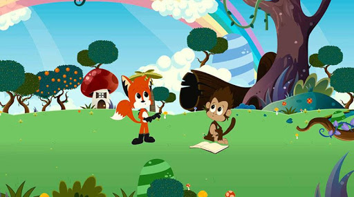 "Esperto o lobinho guará está caminhando na floresta, quando avista seu amigo Juca o macaco que está com dificuldades em seu dever de casa.