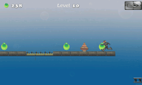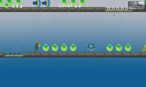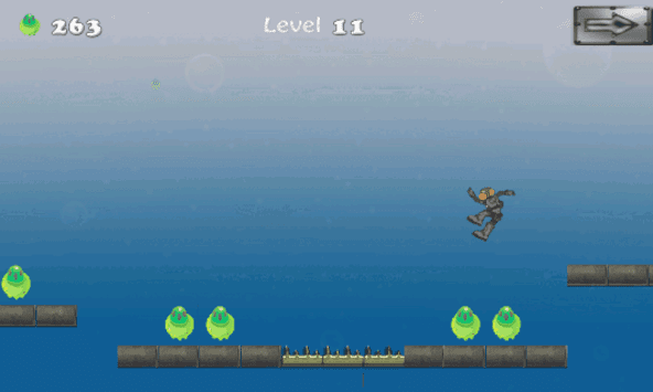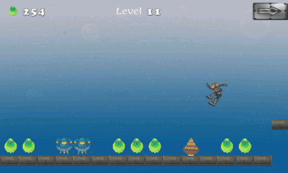 Monkey has a run in the alien spaceship. You need to tap on screen to make the monkey jump and pass over the obstacles. In the way monkey keeps collecting power batteries. There are many obstacles and dangerous pits you need to avoid by tapping on the screen. Use the spring pad for mega jump. When the monkey runs over the spring pad, its jumps higher than normal to reach up to the upper floor.
