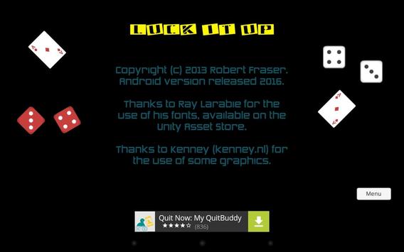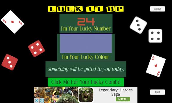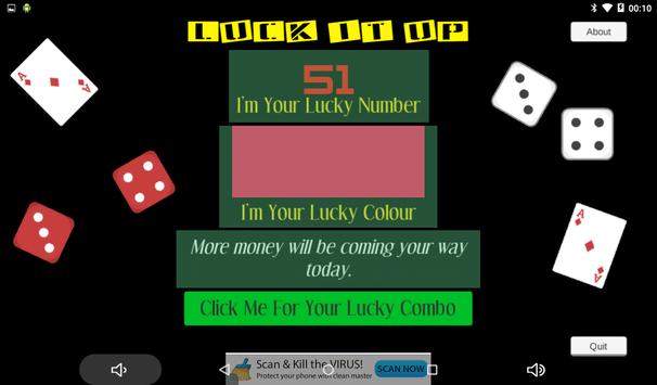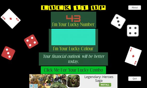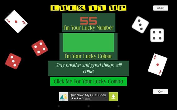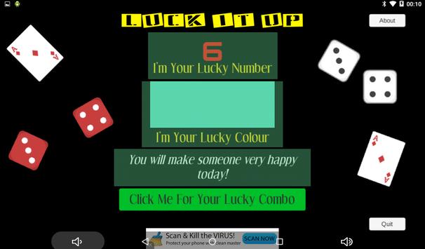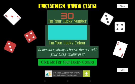 Press the button and let LuckItUp show you a lucky combo - number, colour and good luck message. Use it for lotto, Keno, races, anything where you might need some numbers and colours for that extra bit of luck.