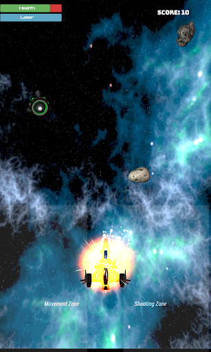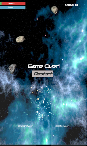 You are captain of a Celestial Corps Spaceship, navigating the dangerous sector K-221 of the universe, filled with asteroids and enemy "Zatan" spaceships. On the way, you will encounter powerups, which will help refill your energy, or get unique guns which will help decimate your enemies. Beware of the bombs though! They mean instant death!