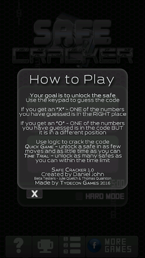 Reminiscent of the old "Mastermind" game - can you unlock the safe? Use logic to decipher the code either in a quick game or unlock as many as you can in the timed mode.
