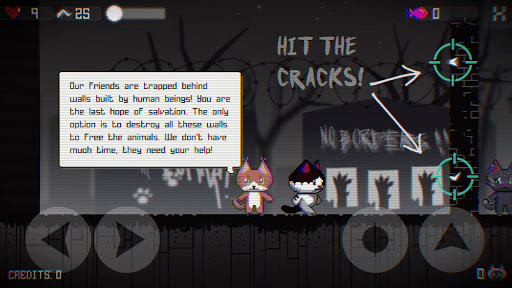 Hero Kitty is a platformer adventure and action game embedded in a dark, falling apart world of boundaries and borders. The nature of this town is rough and full of rebel signs, far from an essence of everyday life. As a player, You have to destroy what is left of the walls, which are dividing the place with your friends, warrior cats, lynxes and others into sad and lonely spots. Player has a powerful ball to throw and bounce to hit the cracks in the walls, which weakens and destroys them. To strike the crack, it requires targeting a suitable spot on the ground for getting the right trajectory. Also the player has to be warefull of the dangerous rubble falling down. As the walls are destroyed, imprisoned creatures are finally free and ready to enter their town with no borders. If you are looking for 2d free platform games for kids, cute games for girls, retro style classic arcade games or just sweet pixel art kitten hero adventures - try Hero Kitty!