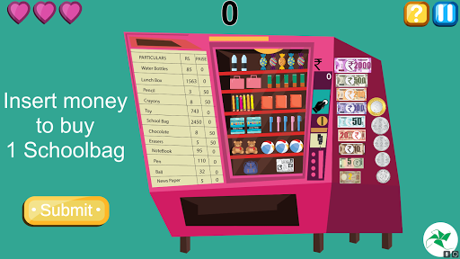 Money game is set of 4 games. In first game children play and learns to recognise rupee and paise. This game is rightly named KNOW YOUR MONEY. In the second games children collect notes and coins and save them in a piggy bank. Thus, the name SAVE MONEY. MAKE MONEY is the third game where children make different combination of notes and coins and save in the piggy bank. Fourth game is all about buying items in a vending machine. Therefore, the name SHOPPING.