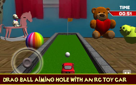 Control a car with remote to drag a ball; aiming to drop the ball in a hole with the flag in it, go across miniature golf track with in a room environment.
