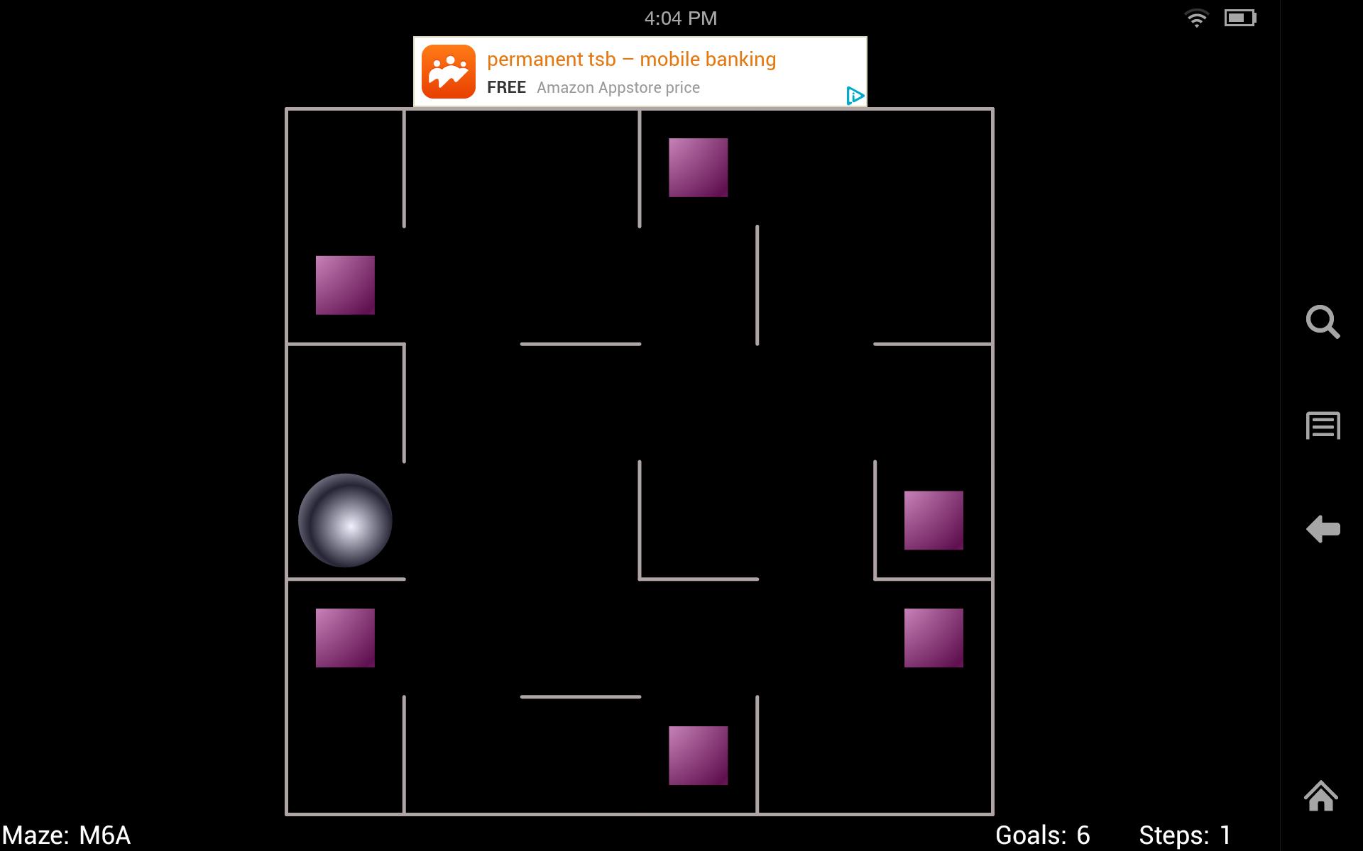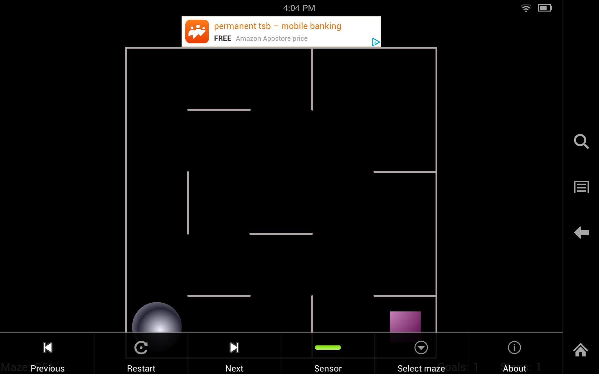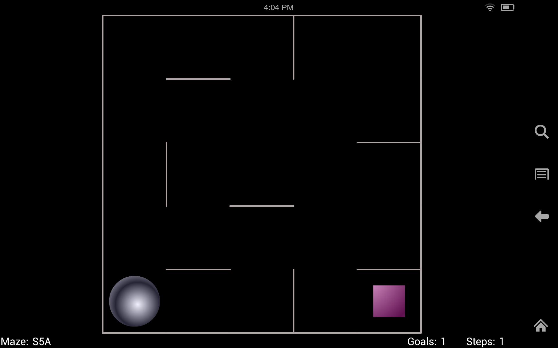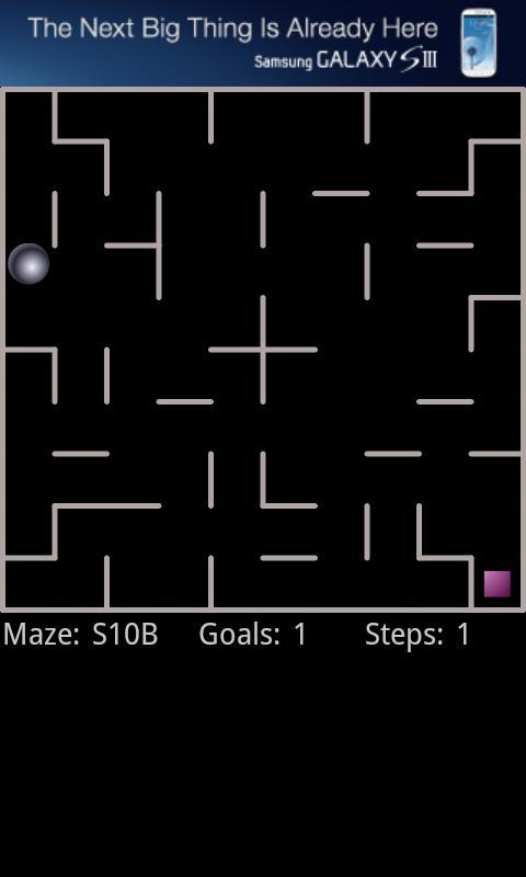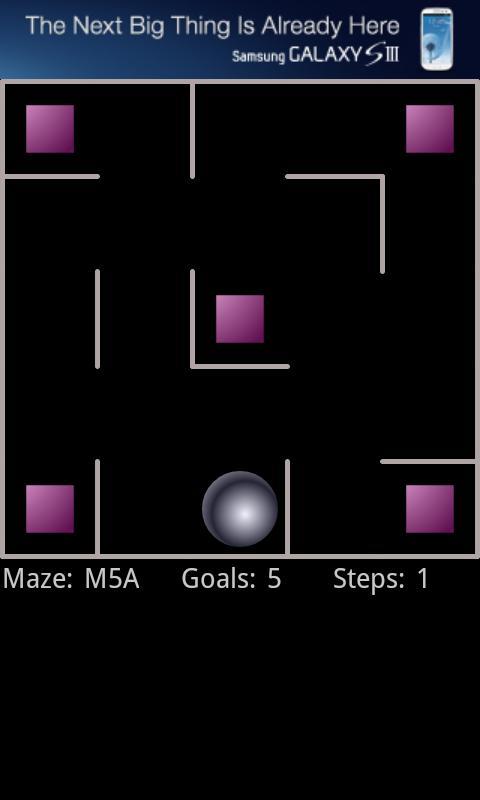 A ball sits in a flat tray containing one or more squares (goals). The challenge is to guide the ball around the tray and collect all the squares. Tilt the phone or tablet to start the ball rolling. The ball rolls in a straight line until it hits a wall, you can then tilt again.