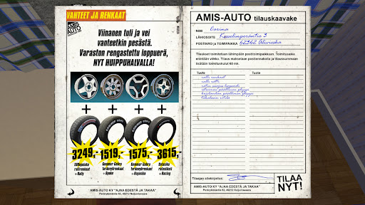 If everything goes well, you have a working car which you can use for various 1990's Finnish countryside summer activities. Basically doing stupid things under influence of alcohol. After you have gathered extra money from various random jobs, you can start to tune and upgrade the car with parts ordered via snail mail. You can turn the car into a obnoxious bass-boom disco machine.... or into a rally car to participate rally competitions... or just fix it into perfect factory condition. Of course car also needs to pass the inspection or you might get into trouble with police.