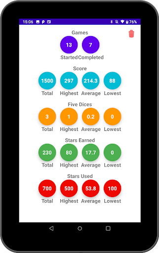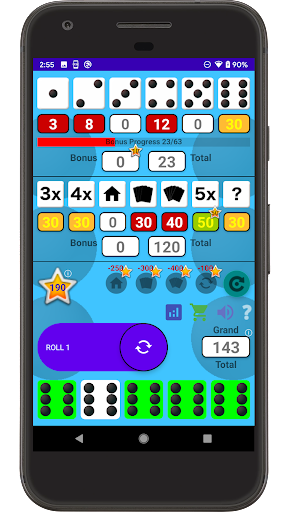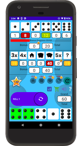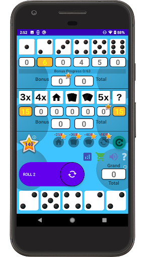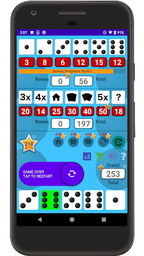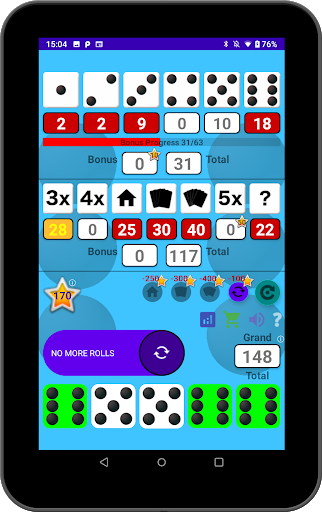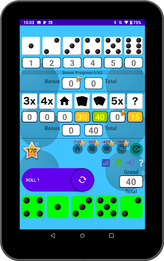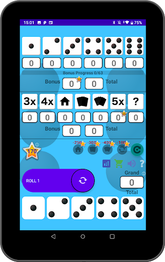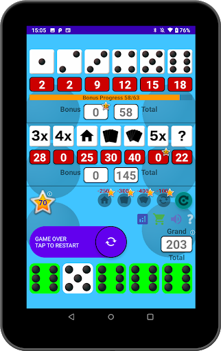 Play along to YAHTZEE rules, but with the added bonus of earning stars for achieving your upper bonus, rolling a five dice & scoring over 250 points. Stars can be used for scoring a full house, small or large straight, or for taking an extra roll.