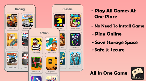 - All in one Game, All Games, In All in one Games app you can play more than 400 games and the Best part it only takes less than 10mb space.