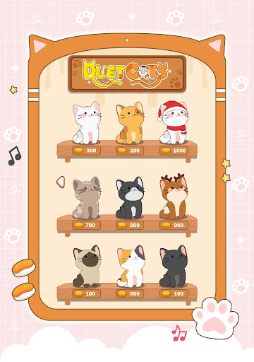 If you're bored with the grey and white cat you started with, it's time to change its look! You can pick from many skins to change the cat breed: cute kitty charm, blackcat, bobtail cat, manul cat, santa cat, shiro cat, coco cat. Upgrade your cute cats and feed them through Duet Cats musical challenges. This list goes on!
