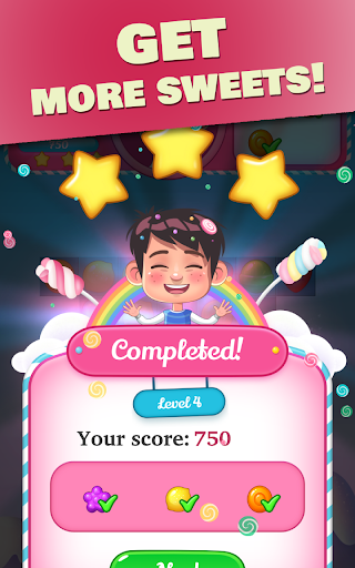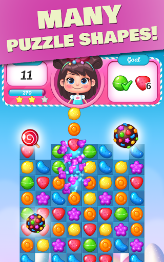 Connect 3 or more candies in the same color and release your finger, sweet candies will blast!