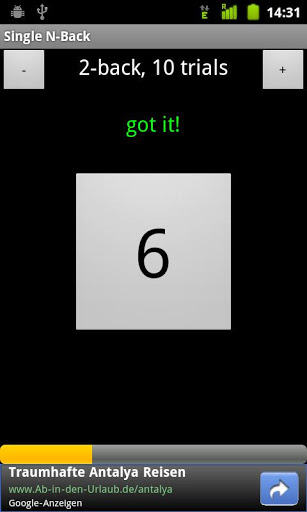 You start with 2-Back, and if you manage to get more than 80% correct, you can unlock the next N-back level.