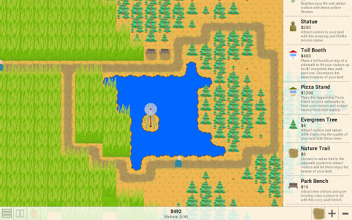 My Land is a farming simulation game from the maker of My Planet, My Business Empire, and My Colony. You begin the game with a blank plot of land and $5000. From there, it is up to you to make it your own. You can create a farm with crops and animals, or you can create a commerce area with side walks and pizza stands, or you can create a nature park with lakes and trails. The choice is yours!