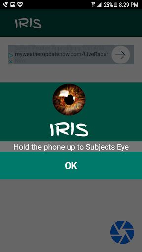 To use the app, open the app and hold the camera up to the subject's eye so the phone can take the initial picture of the subject's eye. Press the camera button in the lower right hand corner of the app. The app will take the first picture of the subject. Proceed to ask the subject the question. The app will compare the biometric parameters of the pictures and return the results of the query.