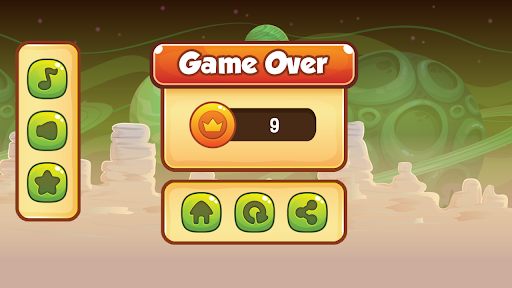 Try to fly as far as possible, do not forget to collect the coins that appear on the flight to quickly achieve high scores. Take care to avoid obstacles and flying alien birds that don't let your alien bump into them.