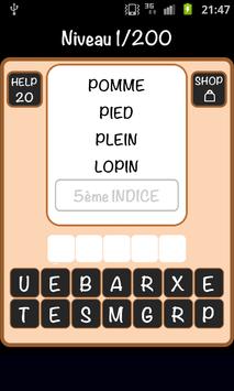 Simple, non ? Parfois oui mais c'est loin d'être toujours le cas. Arriverez-vous à passer les 100 niveaux ? Pour vous aider vous disposerez de points INDICE qui vous permettront d'afficher une 5ème indice, puis les premières lettres du mot à trouver. Offre de lancement du jeu : 30 points INDICE dès le 1er niveau !