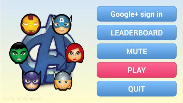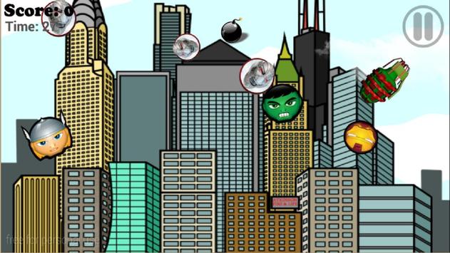 Race against the clock in this fast paced world of random flying items and Icons. Compete with friends and others around the world to be the top score on the Google Leaderboards. Your goal is to touch and collect points for all the Hero Icons and objects you can. Good items include Hero's Hammer, Green Smash Fist, Captain's Shield, and the faces of our Hero's. Avoid the bad Robot and the bombs. With an upbeat soundtrack it is sure to get your adrenaline going to be the highest scorer in the world!