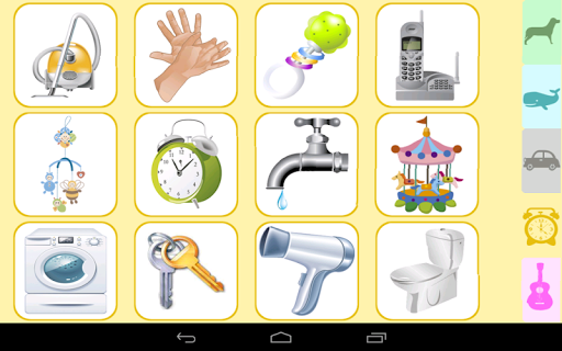 All images have been selected with the aim that the child learns to recognize objects, animals, musical instruments and vehicles with their sounds.