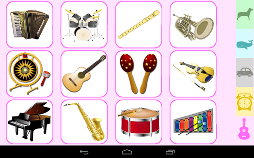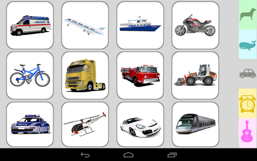 - 5 categories: Pets and Farm Animals, Wild and Aquatic Animals, Vehicles, Musical Instruments.