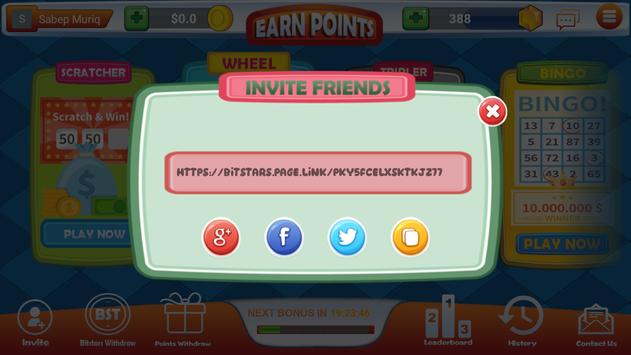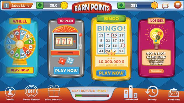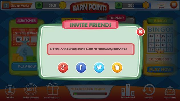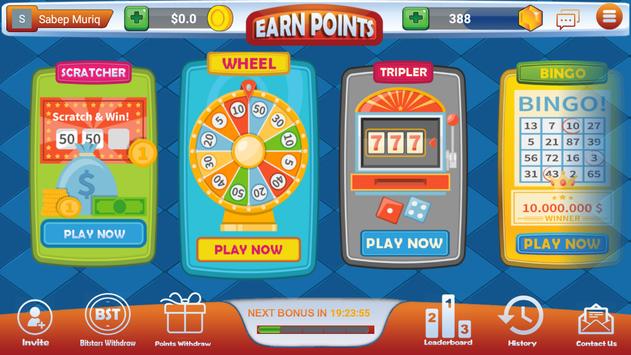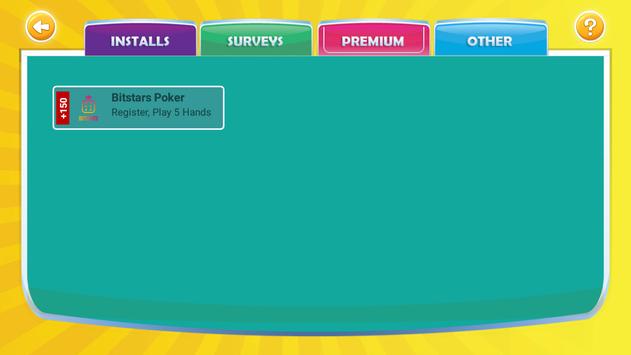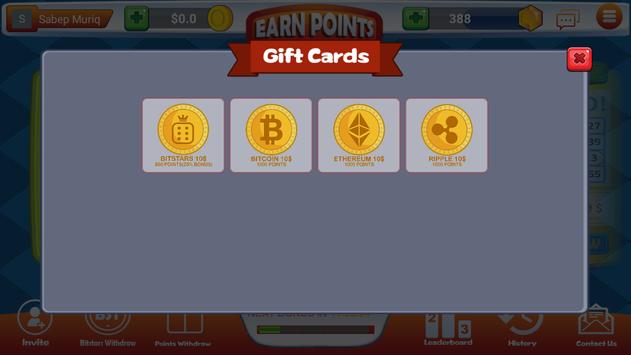 - you can peruse the multitude of games from the home screen or go to EARN POINTS page and you can earn a lot more POINTS from there by downloading games, watching videos, taking surveys. Collected POINTS can be exchanged for Bitcoin, Ethereum, Ripple and Bitstars. Each task has an assigned value of Points, our in-app ledger system for rewards – so complete as many tasks as you like to maximize the earning potential. Check back often as these tasks are continuously updated with new and exciting offers daily.