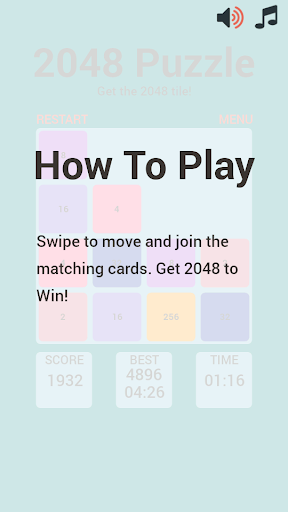 Swipe (Up, Down, Left, Right) to move the tiles. When two tiles with the same number touch, they merge into one tile with double value ( two tiles of 2 merge into 4). When 2048 tile is created, you wins! 2..... 4......8 .....16 ..... 32......64......128......256.......512.....1024 ..... 2048