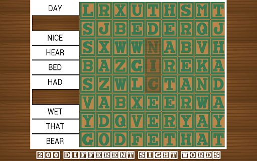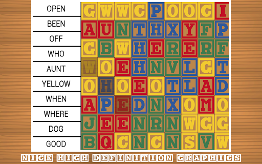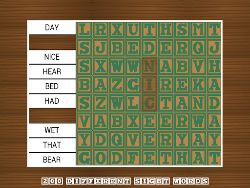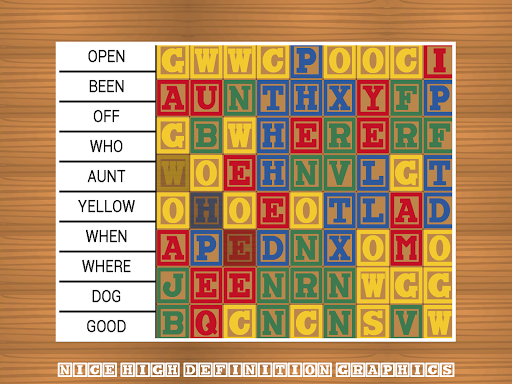 Simply slide your finger across the letters to form a word that's displayed on the left side of the screen. The words are in the wordsearch vertically, horizontally, and diagonally. All of the words are displayed in a forward facing manner. This app will help kids with spelling, reading, writing, speaking, and overall learning first grade sight words. Created for first graders and kids around that grade level. Have fun!