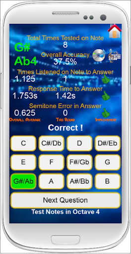In the Test Mode, user is being tested with playing of a single note and is prompted to answer what is the note in the question. User has the option to play the note repeatedly to affirm on his/her response before providing the answer. After answer, the result is populated to provide information on how well the user has done on this current question as well as all historical averages on this note. Information such as the total number of times tested with this note, overall accuracy, the reaction time to respond, the number of times listening to the note before an answer can be provided, and the number of error in semitones between the question and the answer are collected over time and are presented upon answering. A symbol will also be shown to indicate where metrics are improved in current answer comparing to the overage average. The option to listening to the same note and the Classical piano piece is also available upon answering.