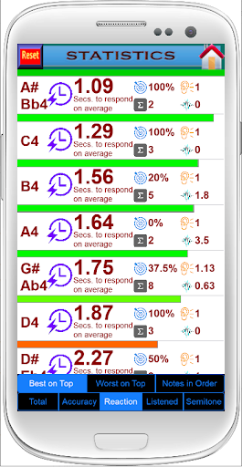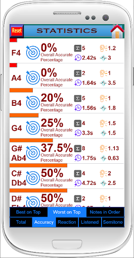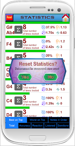 In the Statistics Mode, user can review the data collected within the Test Mode. Statistics can be displayed under sorting per user's desired metrics (Total, Accuracy, Reaction Time, Listened Times and Semitone Error) and sorting order (Best on Top, Worst on Top, Notes in Order) to analyze on, in order to identify which are the notes that they perform worse comparing to the other notes which they can work harder on. User can listen to the note immediately from a long press on the table. Also, a statistics reset option is also available to reset everything to zero for a new round of data capturing from Test Mode.