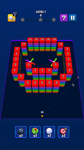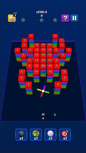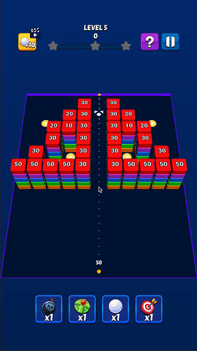 Use special items to ease completing the levels! There are also various boosters in the game field that will let you break more block with a single shot or increase the number of balls!