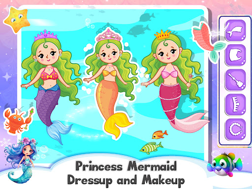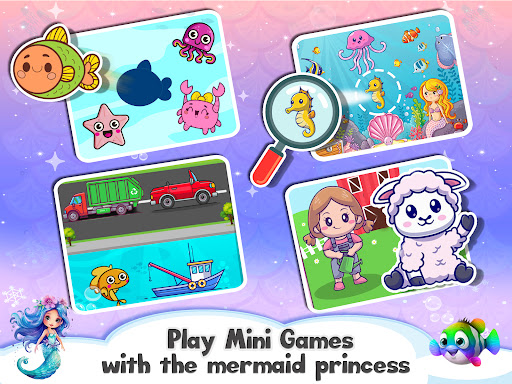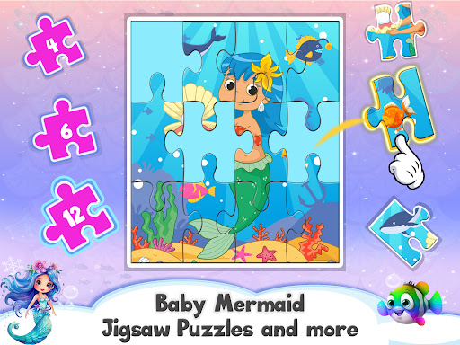 Choose from a wide array of mermaid-themed coloring pages and a vibrant color palette. Jigsaw puzzles featuring beautiful mermaid and adorable aquatic friends. Embark on exciting mini-games like helping crabs catch elusive coins.