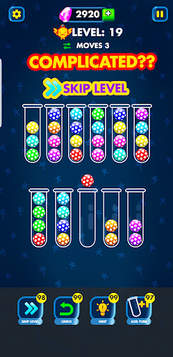 Ball sort water color sort puzzle could be a fun and habit-forming puzzle game! Attempt to kind the colored balls within the tubes till all balls with an equivalent color keep within the same tube. A difficult sort water color puzzle game to exercise your brain! Play anytime at any place and luxuriate in to color puzzle games. color sort puzzle Ball kind of Puzzle could be a terribly attention-grabbing puzzle game. It’s a time-killing game, ball sort puzzle. This free sorting colors puzzle game has brought a challenging means for you and sure as shooting it'll refresh your mind once you play the relaxing water color game. You’ve got completely different steel glass balls and plenty of bottle-kind puzzles with balls. You simply kind the steel color ball of same color glass balls one tube then on. Each bottle will store four-color balls and there's a further tube for sorting balls. If one cup is full then you'll use alternative bottles. Unlimited numbers of swaps in steel color balls game, water games.
