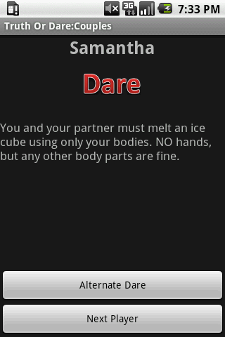The "couples" version of truth or dare focuses on questions couples will find interesting and titilating about one another, with a focus of creating a bond between the couple.
