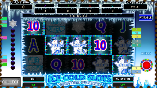 A winter theme bonus betting game machine with icy visuals, chilling snowmen, cool penguins, ice queens lots of opportunities to win big.