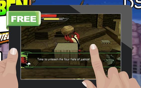 That's good for whatever action figure company has the Ben Fighting license, but daunting for a game designer to tackle so, wisely, this first Ben Fighting game chooses to focus on only a subset of Ben's best transformations. You'll find five altogether, in addition to Ben's normal human form. There's Heatblast, a pyrotechnic alien with the power to control fire and float for a short time. There's Fourarms, the heavy-hitting barbarian who will be your best option in major brawls with bunches of baddies.