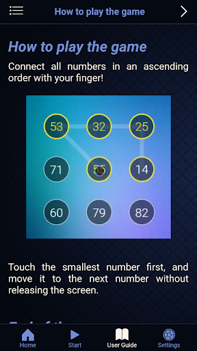 Touch the smallest number first, and move it to the next number without releasing the screen. If you lift up your finger too early, or you move it to the wrong number, the game is over (mission failed). If you connect all numbers in the right order, your mission is successfully completed.