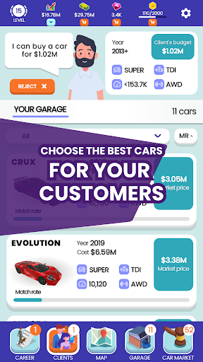 Have you ever thought what it's like to run and expand a used car business? Play as a young entrepreneur and make your own career! “Used Car Dealer” is a used car simulator game that simulates the process of purchasing and selling used cars. You will have several ways of purchasing cars, and almost 100 different car models to choose from. The clients have specific needs. One of your tasks is to find the most suitable car for them!