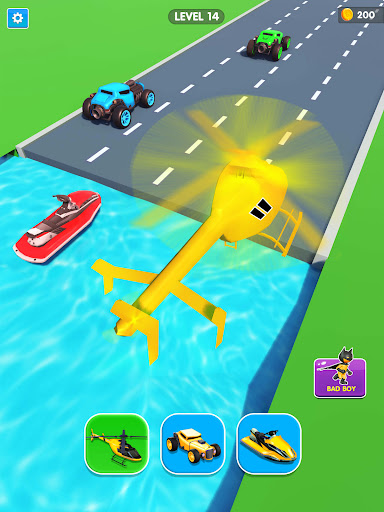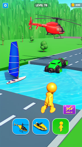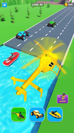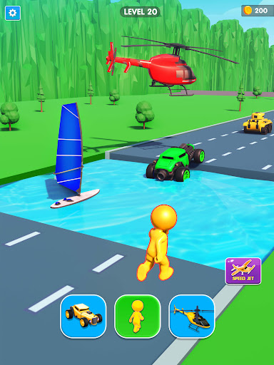 Shape Changer is an action shape-shift run that checks your fast decision-making skills. And if you like shape transform race, shape evolution is a great game for you! Be ready to enjoy hours of shifting games. In the Shape Shifting Game, you need to change the shape of your character to be a different vehicle. Swiftly switch to a car, helicopter, or boat as they go through different tracks and environments. If you're too slow, you start again. Just tap your mobile screen to play Shape Evolution. Shift between different vehicles on tracks through land, air, and sea. Rapid adapts in this shape shifting car game to beat challenges and win against others. Can you master the change shape game?