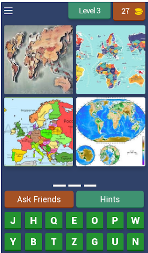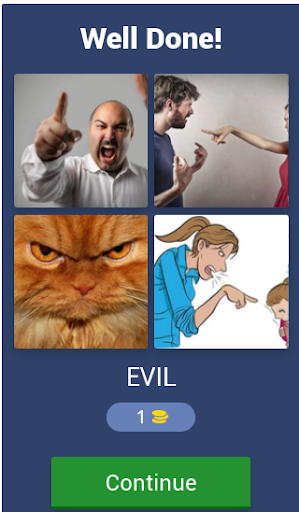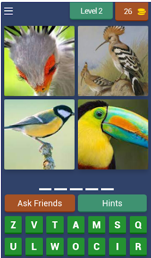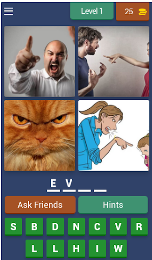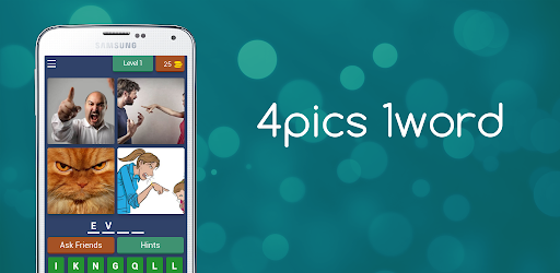 4 Pics 1 Words gameplay is very simple: each level displays four pictures linked by one word - the player's aim is to work out what the word is, from a set of letters given below the pictures.