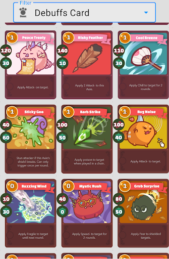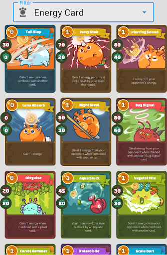 ✨✨✨ Full Collection of class cards (Aqua, Beast, Plant, Bird, Reptile, Bug), you can see full info about any card to buy suitable Axies. Moreover, Melee Attack and Ranged Attack help you build the best team for PVP.