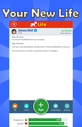 How will you live your life? Get the life simulator the amazing game of life and control text choices.Make the right choices related to all aspects of life in life sim. Simply simulate the life you wish you’d have with sim life simulator game. Choose among text decisions but choose more wisely for what you choose with affect your happiness, health and wealth also. Manage activities, assets, carrier, school life, relationship and more in full of fun life simulator game.