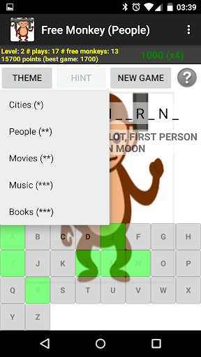 - 5 themes (in order of difficulty): cities, (famous) people, movies, music, books