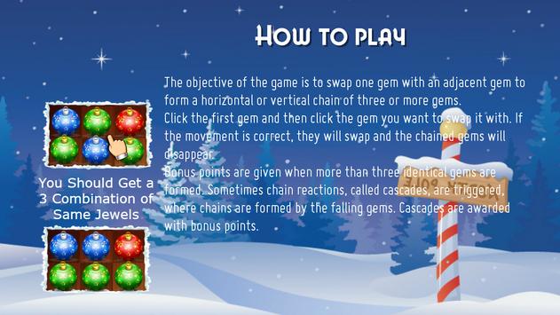 Christmas Match 3 on every square to destroy all the squares under the jewels. Then a magic candy will appear. Let the candy fall off the board to win.