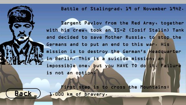Sargent Pavlov from the Red Army, together with his crew, took an IS-2 (Iosif Stalin) Tank and decided to save Mother Russia, to stop the Germans and to put an end to this war. His mission is to destroy the German's Headquarter in Berlin. This is a suicide mission, an impossible one, but you HAVE TO do it. Failure is not an option.
