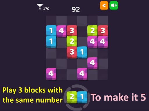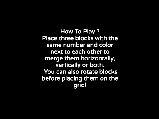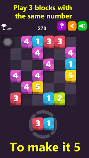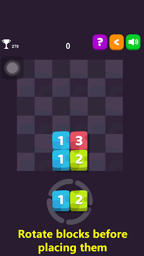 Place three blocks with the same number and color next to each other to merge them horizontally, vertically or both. You can also rotate blocks before placing them on the grid! The block will increase value from 1 to 5. The more value block has, the more points you get.